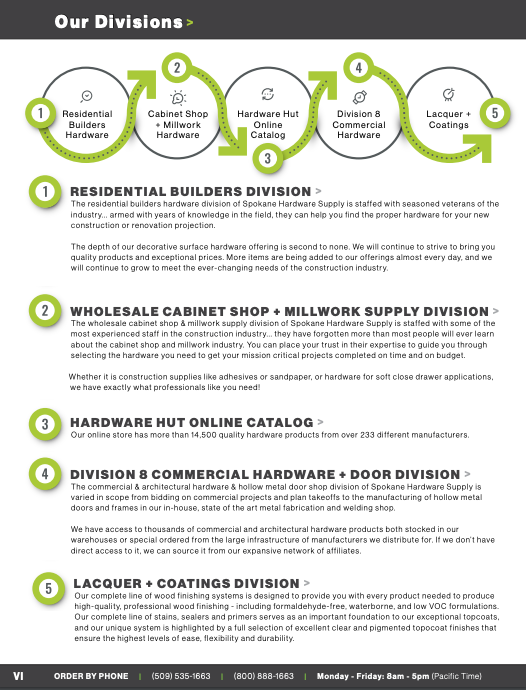 This catalog is one of Spokane Hardware Supply’s most comprehensive design assets. The goal was to create a clean, structured, easy-to-navigate reference piece that organizes hundreds of SKUs across multiple product categories. I designed the full layout system, built a consistent visual language, and prepared all press-ready files.
