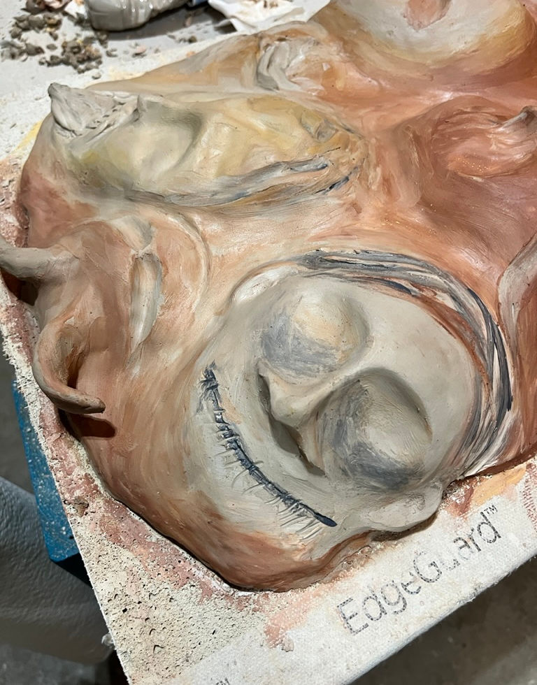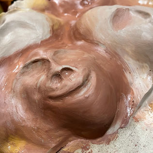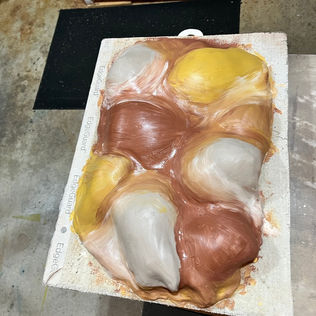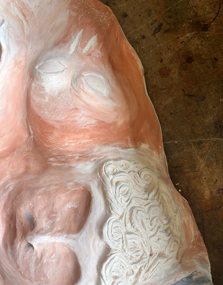 Created this piece with the max width our kiln could handle and new I wanted to use many different clay slips to add a special detail...I see different things familiar to me inside this.